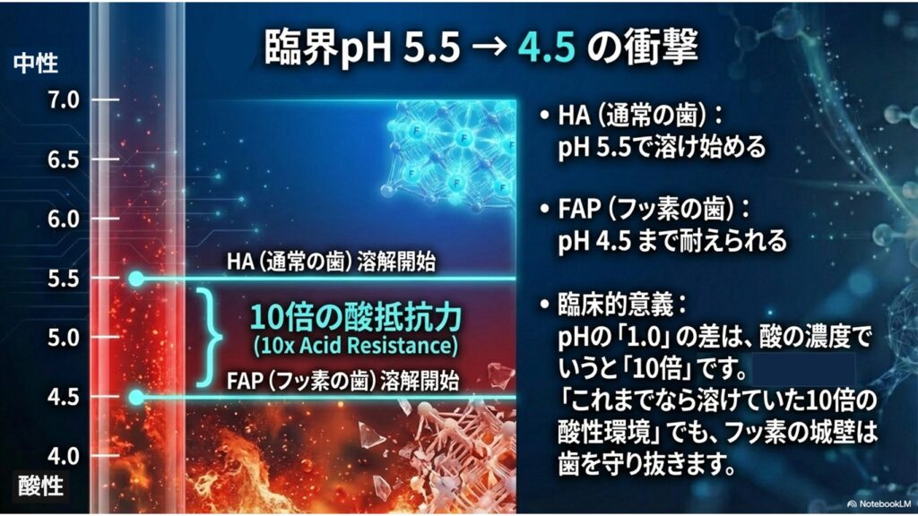- 普通の歯 → pH5.5で溶け始める